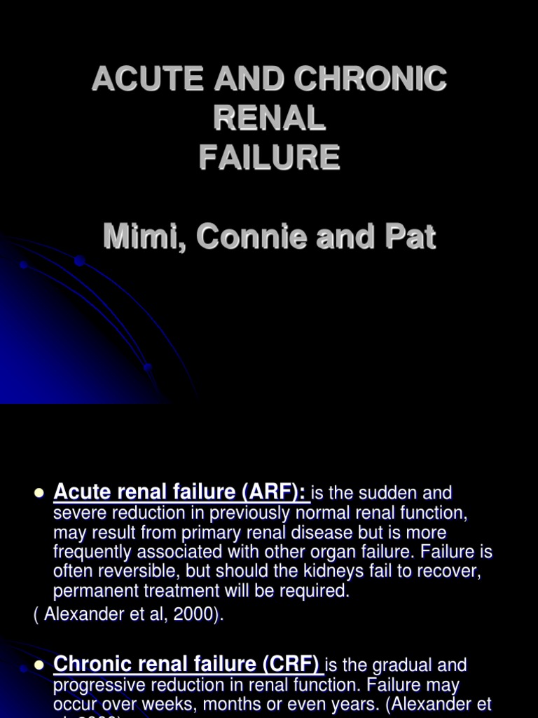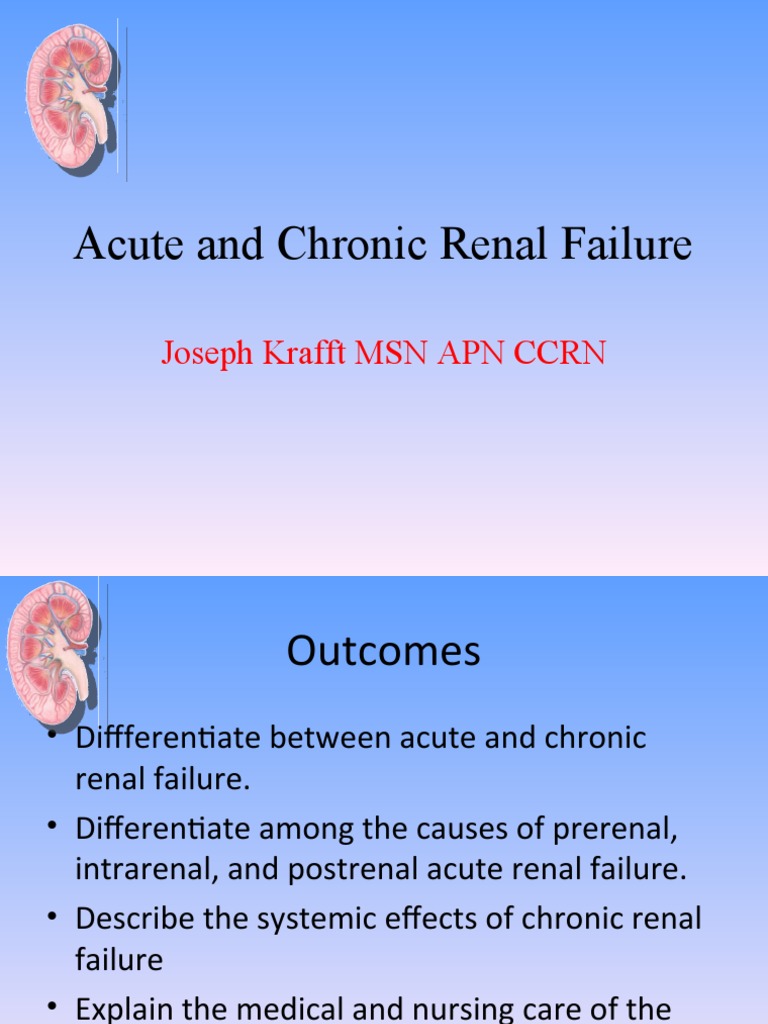 This paper presented reviews the literature on acute renal failure in infants: If you are the copyright owner for this file, please report abuse to 4shared. The substances normally eliminated in the urine accumulate in the. ´ definite treatment for patients with renal failure ´ deceased donation or live donation (related or nrld) ´ scarcity of. Renal failure <ul><li>results when the kidneys cannot remove the body's metabolic wastes or perform their regulatory functions.